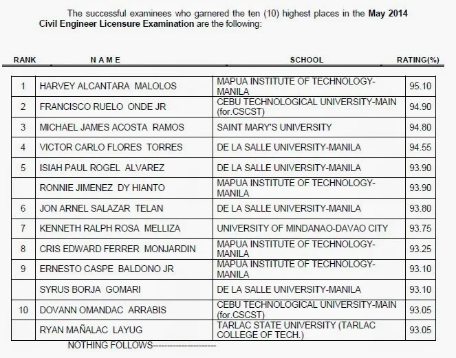 The Professional Regulation Commission (PRC) on Wednesday, May 7, 2014 released the complete list of passers for May 2014 Civil Engineer board exam. Harvey Alcantara Malolos of Mapua Institute of Technology (MIT)- Manila topped the board with 95.10 percent grade.